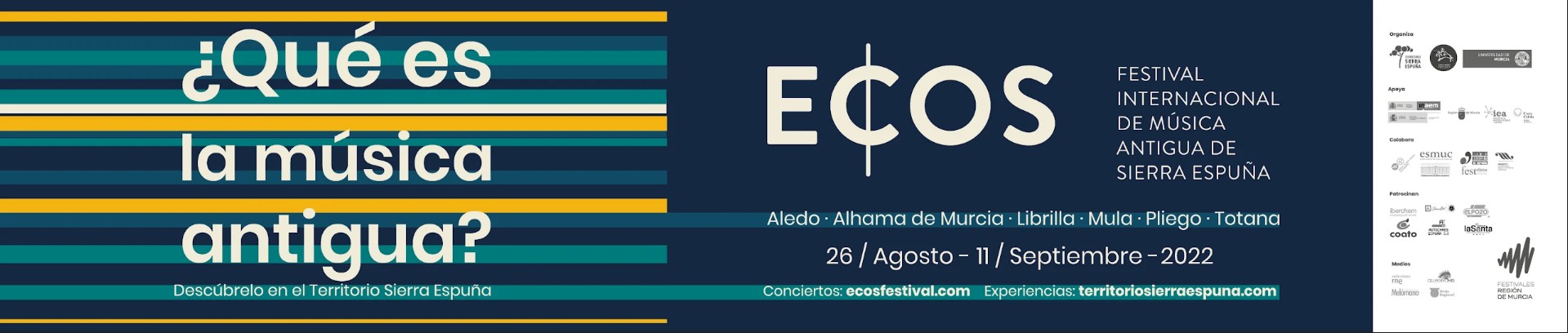 Los seis municipios del Territorio Sierra Espuña (Aledo, Alhama de Murcia, Librilla, Mula, Pliego y Totana) se preparan para acoger la VI edición del ECOS Festival Internacional de Música Antigua de Sierra Espuña. El evento, que ha ido creciendo edición tras edición proyectando la cultura en enclaves emblemáticos de la Región, propone doce conciertos del 26 de agosto al 11 de septiembre que se complementan con visitas turísticas, degustación de productos ecológicos y artesanales, actividades infantiles y una nueva edición de ECOS Labs.